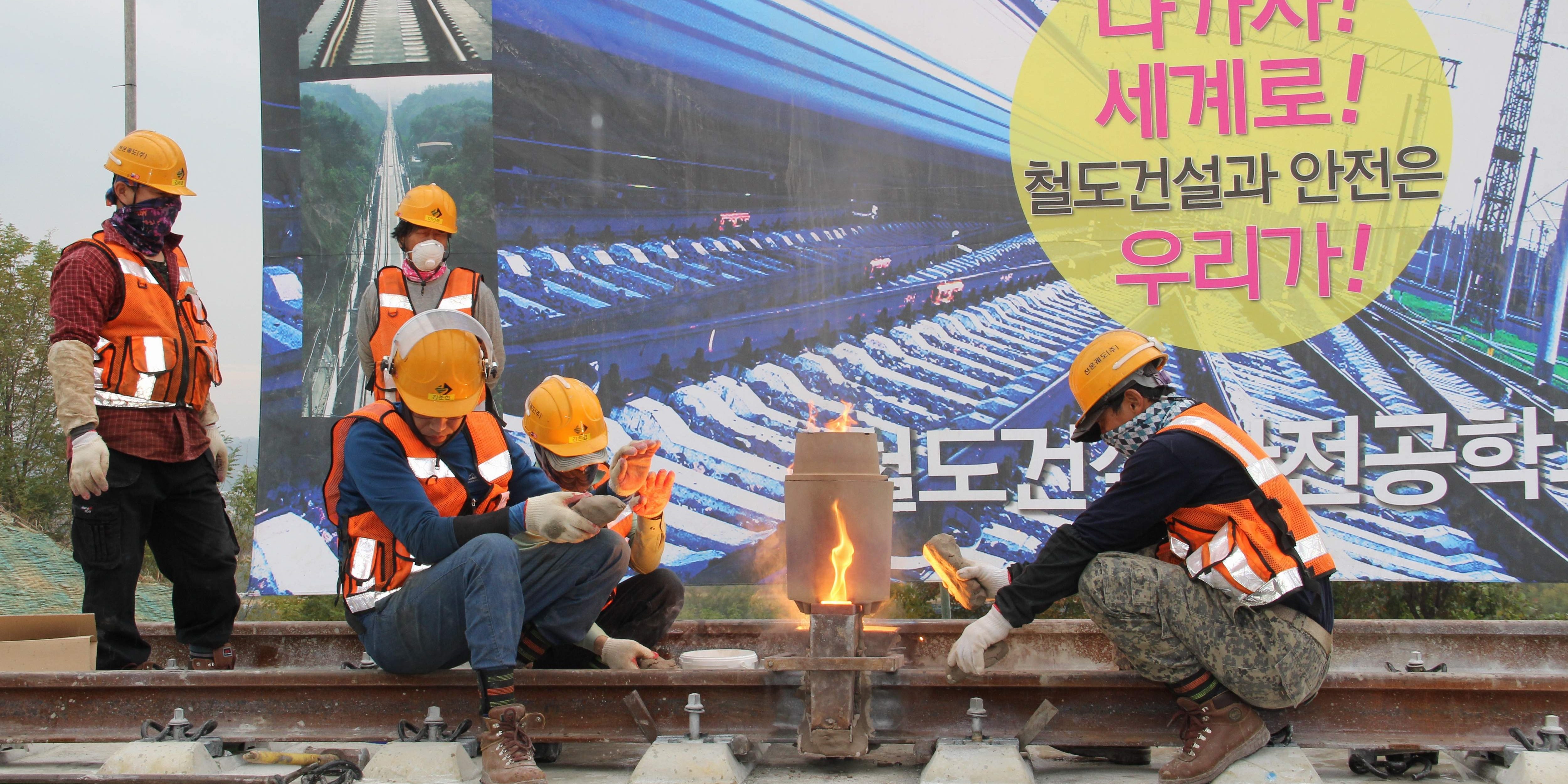 [사진설명] 동양대 철도대학 철도건설안전공학과는 10월 23일 「선제적 장애예방 및 유지보수 효율화를 위한 궤도상태평가시스템 및 유지기술개발과 연구과제」의 기술개발 일환으로 캠퍼스에 구축된 고속철도 콘크리트 궤도/노반 시험장 준공식을 개최했다. 사진은 구축레일 용접 시연장면.