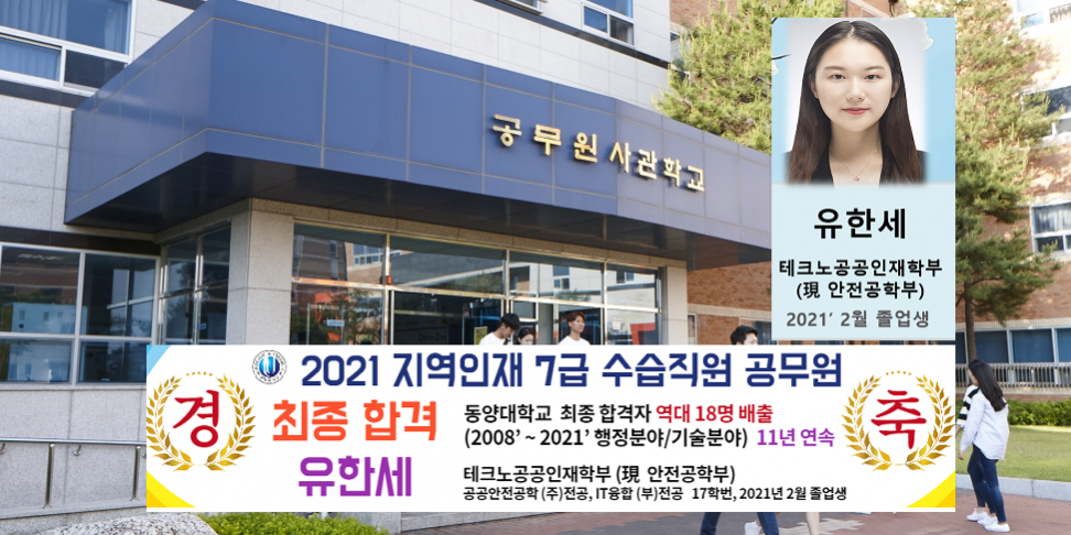 동양대학교(총장 권광선)는 인사혁신처가 시행하는 2021년도 국가직 지역인재 7급 수습직원 선발시험에서 유한세(24, 테크노공공인재학부, 現스마트안전시스템학부 2021년 2월 졸업) 학생이 최종 합격했다고 밝혔다.