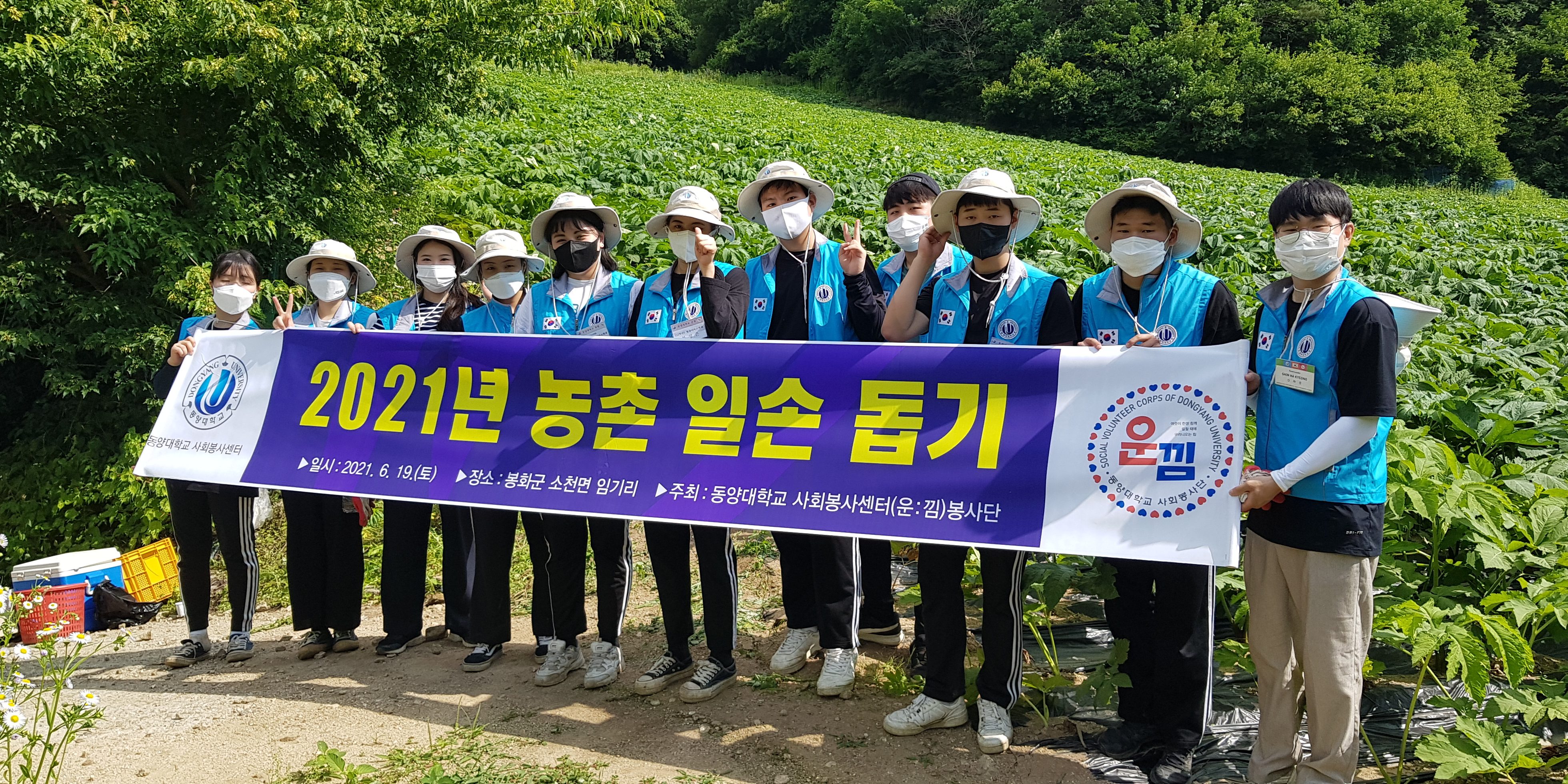 6월212021DYU뉴스동양대 운낌 봉사단은 6월 19일(토)에 봉화군 소천면 분천1리(2곳)에서 농촌 일손 돕기 봉사활동을 진행하였다. 봉사활동은 농협 중앙회와 함께 “소천면 약초 작목반” 당귀밭 잡초 제거 작업을 오전 8시부터 시작하여 오후4시까지 진행하였다. Category: DYU뉴스By 홍보팀2021년 6월 21일Post navigationPreviousPrevious post:[교수동정] 김민주 교수의 저서 『2021년 세종도서 교양부문』에 선정NextNext post:[보도] 동양대학교, 11년 연속 국가직 지역인재 7급 수습 공무원 배출