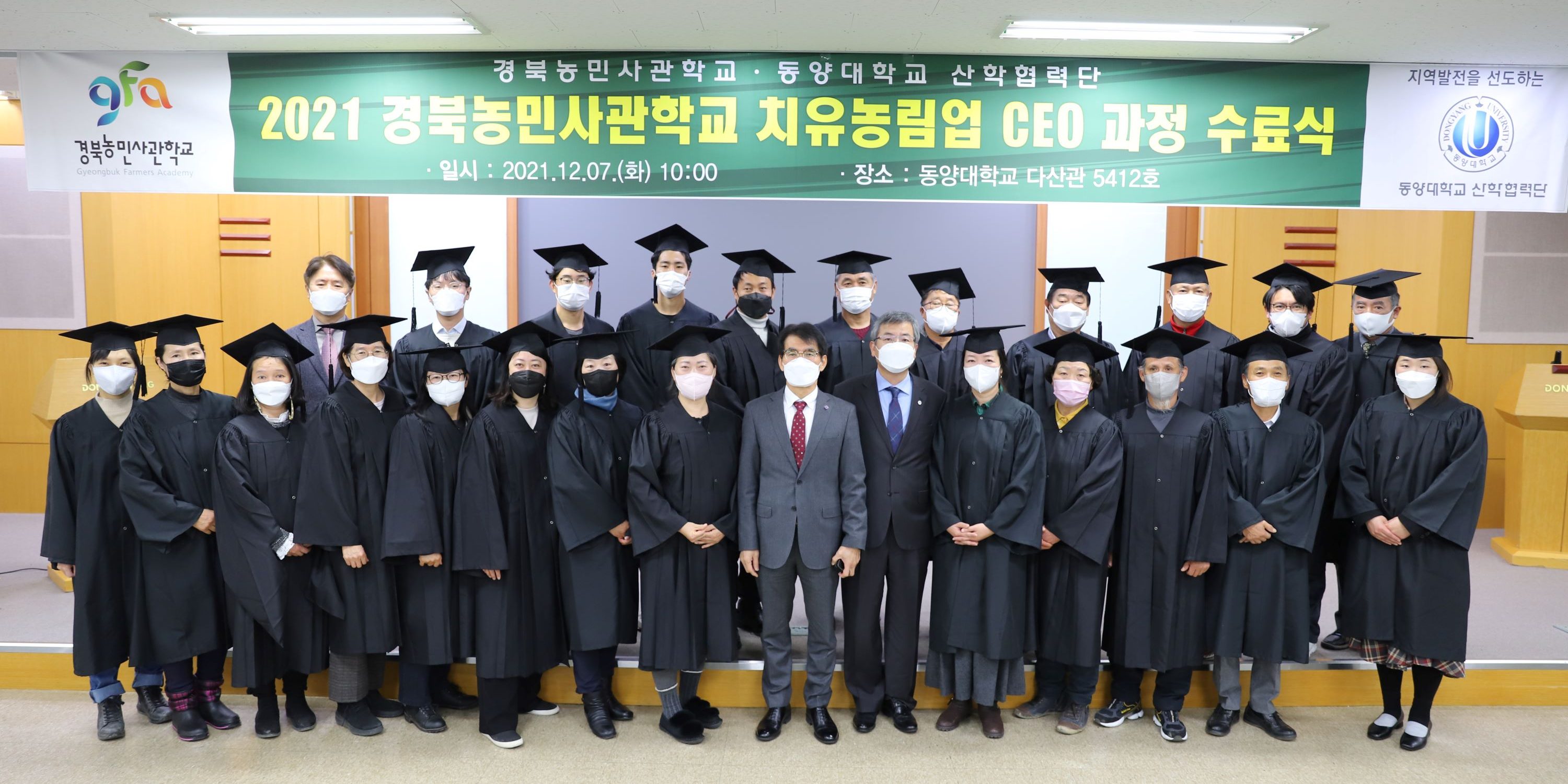 12월72021DYU뉴스2021년 12월 7일에 동양대학교에서 2021 경북농민사관학교 치유농림업 CEO 과정 수료식을 하였다. 동양대학교 이하운 총장, 경북농민사관학교 조흥구 학교장, 치유농림업 CEO과정 홍연웅 책임교수님과 수료생 30명이 참석하였다. 수료식에서는 수료증 및 우수상(1명), 모범상(1명), 공로상(5명), 치유농업인상(수료생전원 30명, 대표 남상대, 이은희 교육생)을 수여하였다. Category: DYU뉴스By 홍보팀2021년 12월 7일Post navigationPreviousPrevious post:[보도] 동양대 산학협력단, 2021 영주시 농업인 전문교육 헬스파밍 과정 수료식NextNext post:[보도] IBK기업은행, 동양대에 장학금 200만원 전달