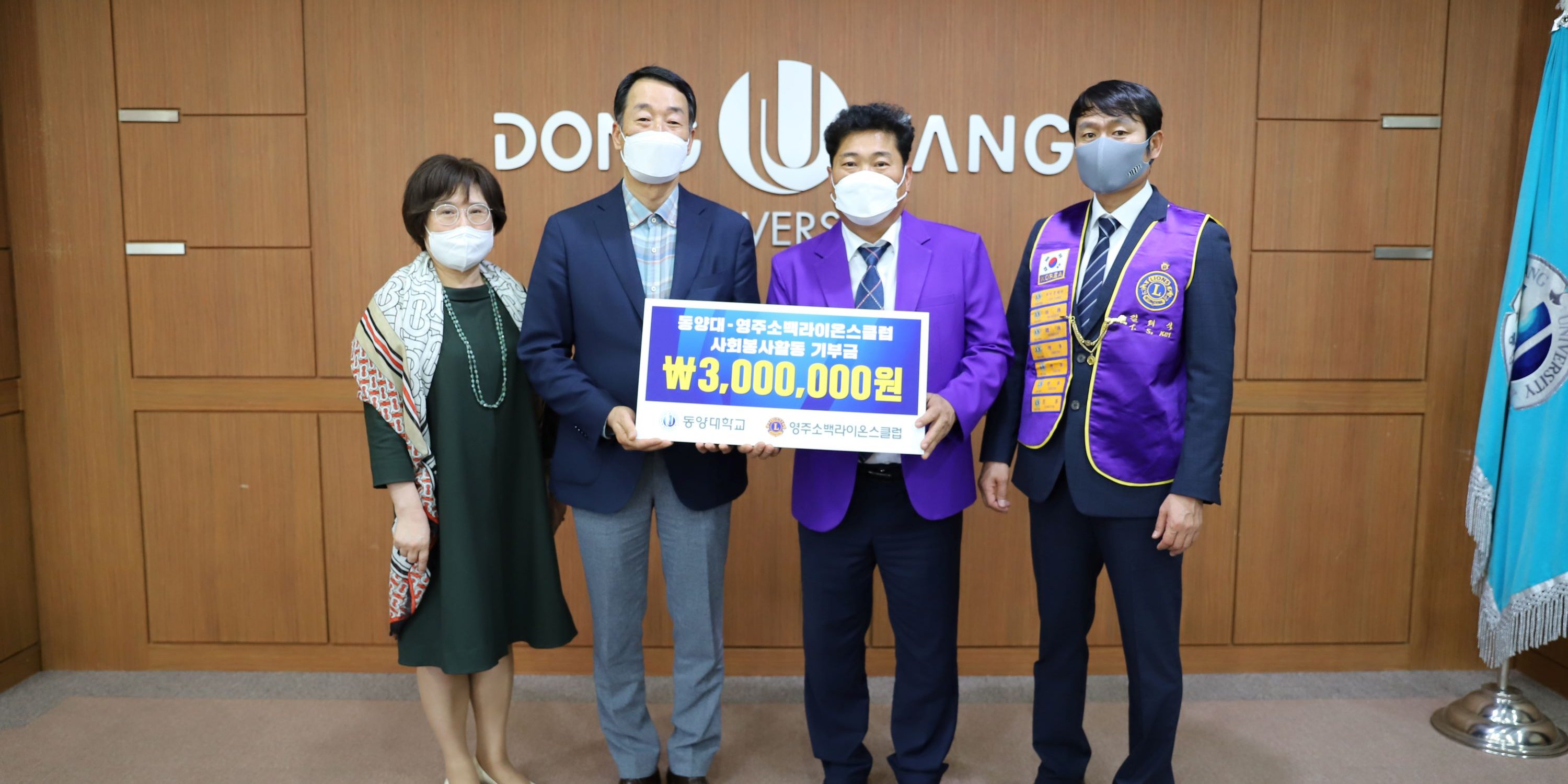 5월42022DYU뉴스영주 소백라이온스 클럽 강제현 회장과 김태식 1부회장은 5월 3일 동양대학교 대학본부 2층 회의실에서 남정환 경영부총장, 박혜숙 취업학생처장이 참여한 가운데 금삼백만원을 기탁하는 행사를 가졌다. 영주 소백라이온스 클럽은 동양대학교 학생들을 위하여 4년째 꾸준히 우리 대학에 기부를 하고 있다. Category: DYU뉴스By 홍보팀2022년 5월 4일Post navigationPreviousPrevious post:[보도] 동양대 운낌 봉사단, 집수리 ‘라온하제’ 봉사활동 진행NextNext post:[보도] 2022년 2급 치유농업사 양성과정 개강식 개최