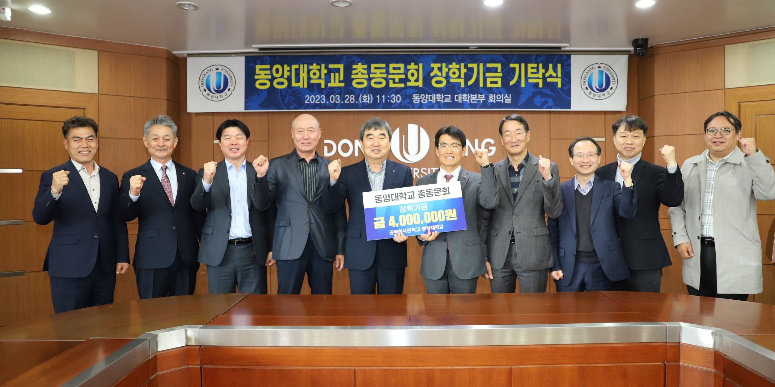 3월282023DYU뉴스동양대 총동문회에서 장학기금 4백만원을 기탁해주셨습니다. 금일 기탁식 행사에는 총동문회 남정순 회장님, 권영복 부회장님, 서승범 이사님, 나진훈 사무총장님, 김주민 사무국장님께서 참석해주셨고, 대학에서는 이하운 총장님, 남정환 경영부총장님, 박용권 교무처장님, 정지승 기획조정실장님, 노경철 산학협력단장님이 참석하였습니다. Category: DYU뉴스By 홍보팀2023년 3월 28일Post navigationPreviousPrevious post:[보도] 동양대학교 제29대 총학생회 「선행」 출범식 진행NextNext post:[보도] 동양대, 미래차전환부품사업단 미래차 R&D콜라보 ‘디지털트윈 전기차 시각화’ 워크샵 성료