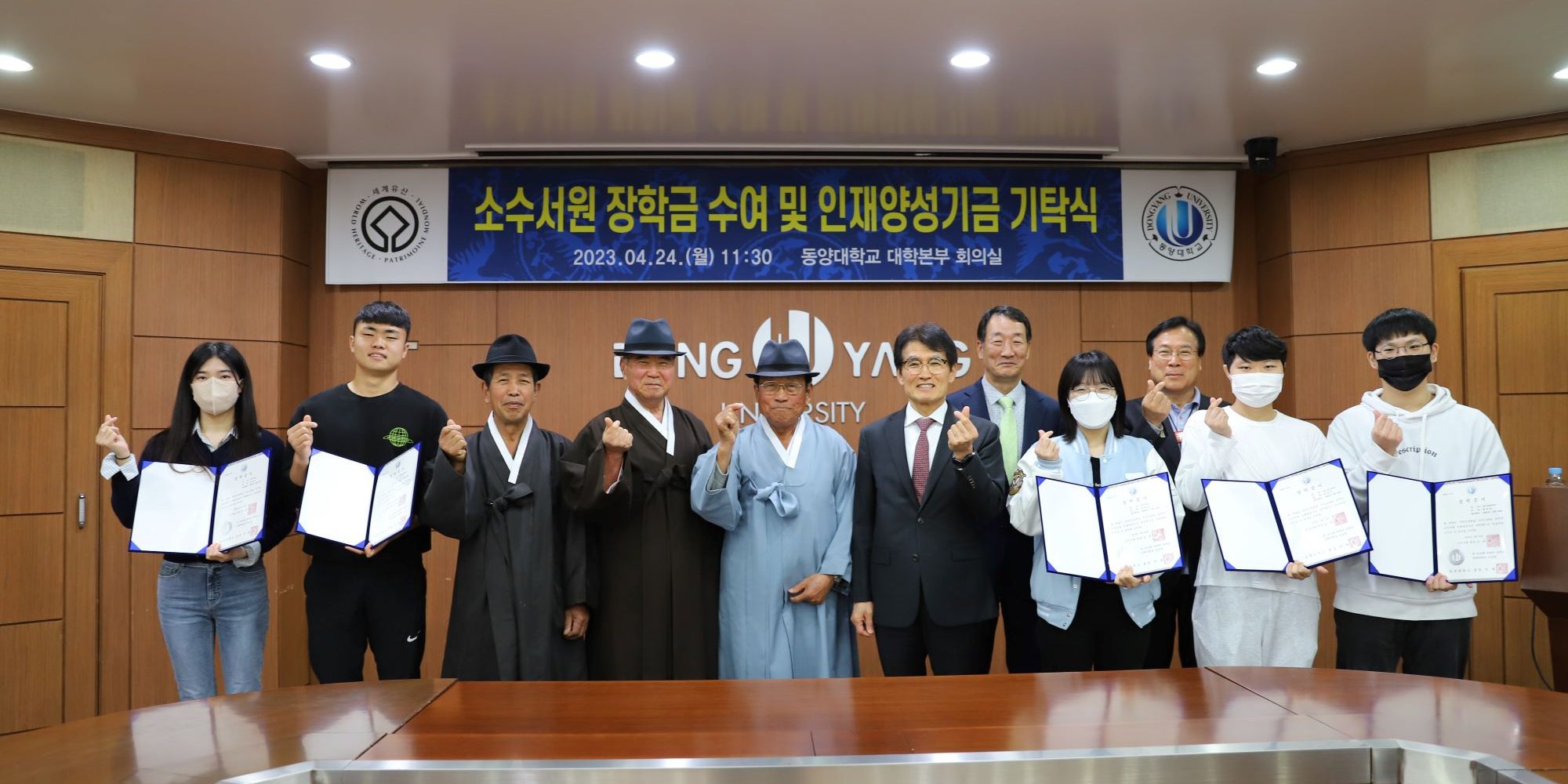 4월242023DYU뉴스동양대(총장 이하운)는 대학본부 2층 회의실에서 소수서원 장학금 수여식을 개최했다. 소수서원장학금은 부모와 영주시에 거주하는 동양대학교 재학생으로 선비인성함양의 기초소양을 갖춘 자로 선발했다. Category: DYU뉴스By 홍보팀2023년 4월 24일Post navigationPreviousPrevious post:[보도] 경상북도 경찰청( 과학수사과)과 동양대 경찰행정·범죄심리학과 업무 협약 체결NextNext post:[보도] 동양대 웹툰애니메이션학과, 전문가 초청 특강 진행