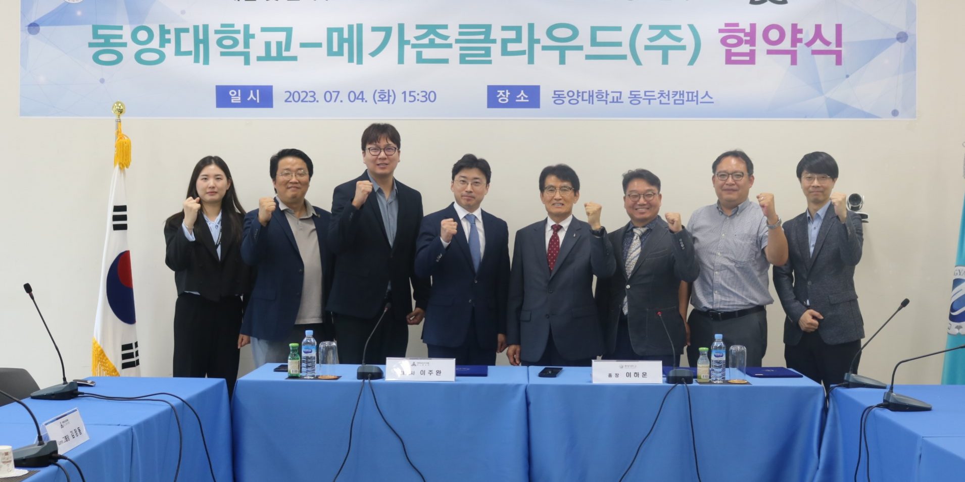 7월112023DYU뉴스동양대(총장 이하운)는 메가존클라우드(주)(대표 이주완)와 7월 4일(화) 동두천 캠퍼스 대학 본부 2층 회의실에서 게임 및 클라우드 산업 육성과 핵심기술 발전을 위해 상호 협력하기로 업무 협약을 체결했다. 협약식에는 동양대 이하운 총장, 메가존클라우드(주) 이주완 대표외 양 기관 관계자 10여명이 참석했다. Category: DYU뉴스By 홍보팀2023년 7월 11일Post navigationPreviousPrevious post:[보도] 동양대학교 현암교양교육원, ‘학생자율설계 교양교육 공모전 수상작 모음집’ 발간NextNext post:[보도] 남정환 부총장, 영주고 초청 「자연과학과 문명 그리고 공학」 특강 진행