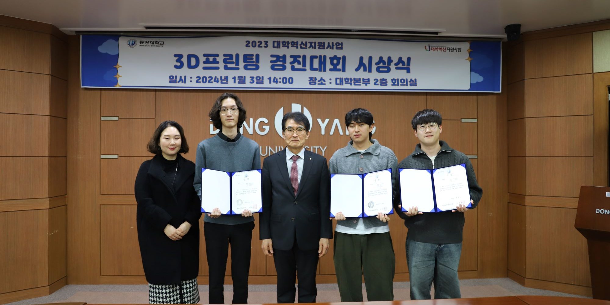 1월82024DYU뉴스교수학습지원센터에서는 2023 대학혁신지원사업으로 3D프린팅 경진대회를 열어 학(부)과 학습 교보재 또는 실생활에서 사용 가능한 실용 아이디어를 3D프린터로 제작하여 제출한 참가자 중 최우수상 1명, 우수상 2명, 장려상 3명에게 시상하였다. Category: DYU뉴스By 홍보팀2024년 1월 8일Post navigationPreviousPrevious post:[보도] 동양대 교수학습지원센터, 교직원 직무역량 강화를 위해 찾아가는 통계캠프 진행NextNext post:[보도] 동양대 213학군단 2023년 동계입영훈련 출정식 행사 진행