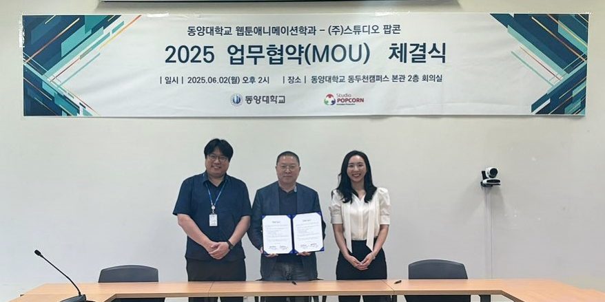 동양대학교(총장 최성해) 웹툰애니메이션학과는 지난 2일 웹툰애니메이션 전문 인재양성을 위해 ㈜스튜디오 팝콘과 업무협약을 체결했다고 밝혔다.