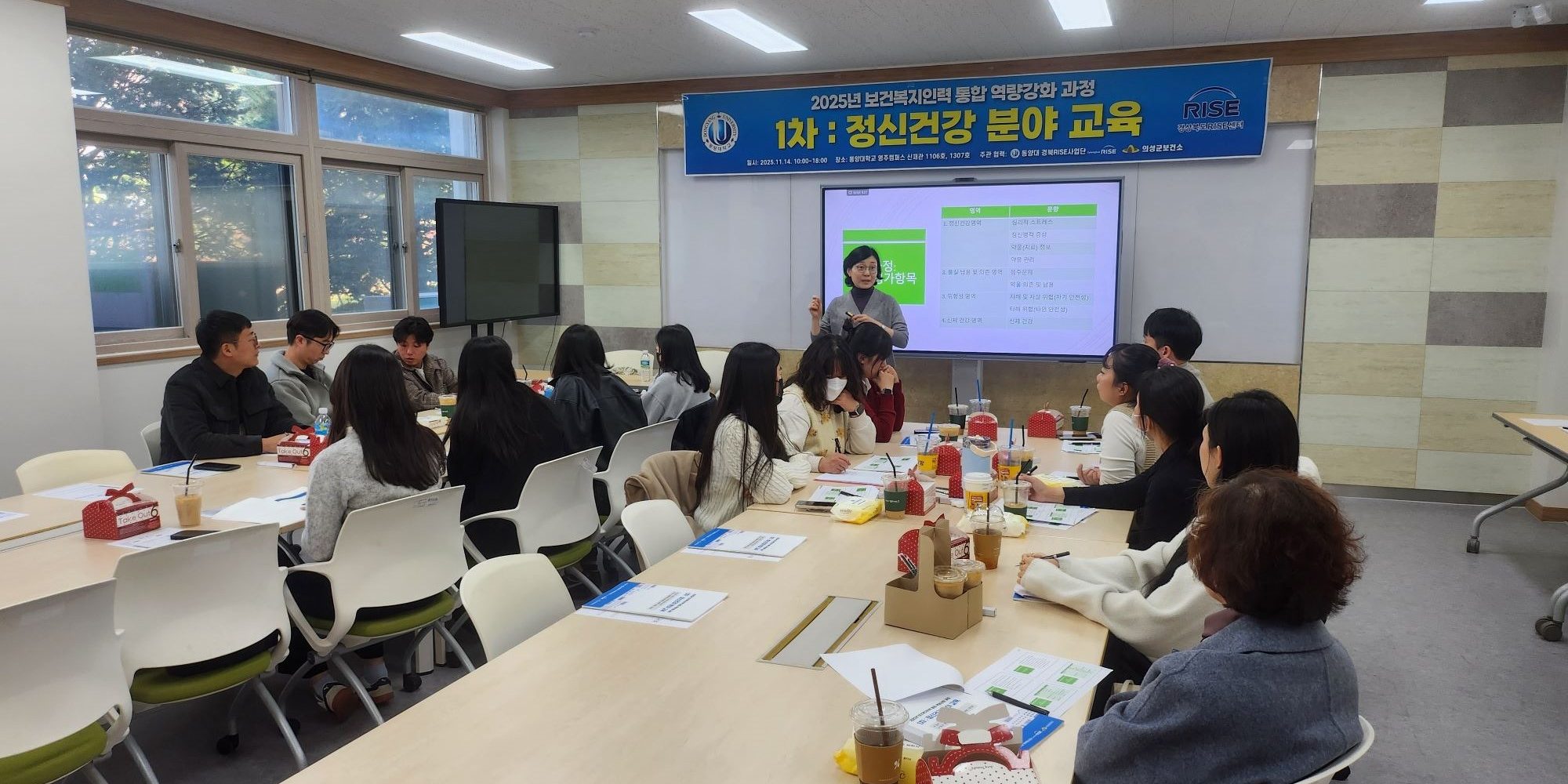 동양대학교 경북RISE사업단은 2025년 11월 14일(금), 의성군 보건소와 공동으로 「2025년 보건복지 인력 통합 역량 강화 과정」의 첫 번째 교육인 정신건강 분야 교육을 운영하였다. 이번 교육은 2025년 경북 산불 피해 지역(안동시, 영덕군, 영양군, 의성군, 청송군)의 정신건강복지센터 종사자들을 대상으로 진행되었다.