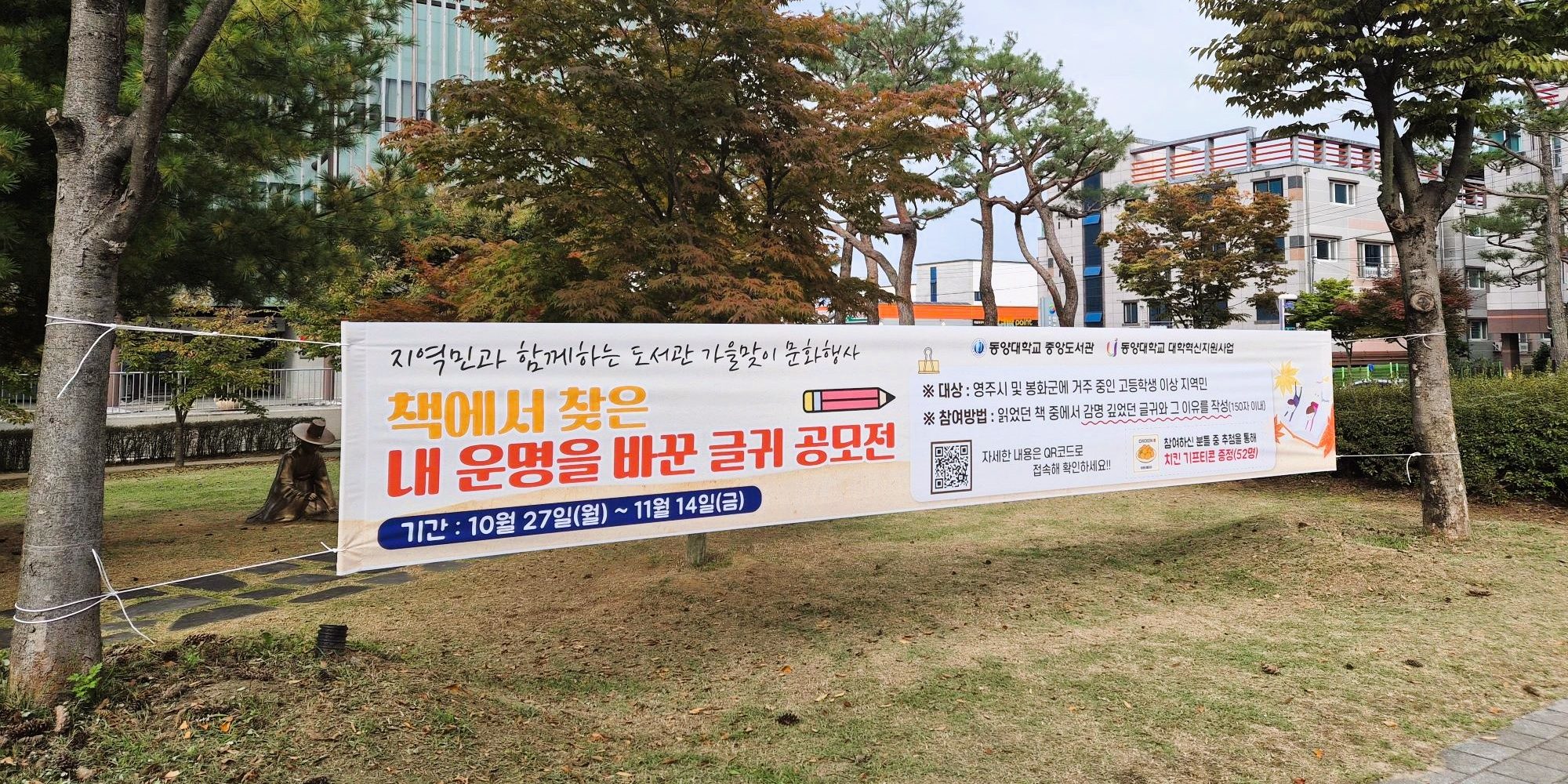 동양대학교 중앙도서관(관장 김태완)에서는 대학혁신지원사업의 일환으로 10. 27(월) ~ 11. 14(금)까지 영주캠퍼스 – 영주, 봉화 지역민. 동두천 캠퍼스 – 동두천, 연천, 양주 지역민을 대상으로 독서의 계절 가을을 맞이하여 책 읽는 분위기를 조성하고 지역사회와 상생하는 도서관 환경구축을 위해 “책에서 찾은 내 운명을 바꾼 글귀 공모전”을 실시하였습니다.