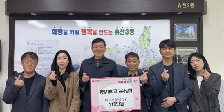 동양대학교 봉사단체 ‘늘사랑회’(회장 이재기)는 지난 7일 영주시 휴천3동(동장 최재식) 행정복지센터를 방문해 영주사랑상품권 110만 원을 기탁했다고 밝혔다.