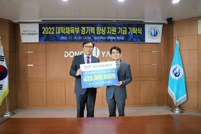 동양대(총장 이하운)는 국민체육진흥공단 경주사업총괄본부(본부장 이홍복)가 발전기금 2천만원을 기탁했다고 16일 밝혔다. 동양대 대학본부 2층 회의실에서 열린 발전기금 기탁식에는 이하운 총장, 남정환 경영부총장, 정지승 기획조정실장, 노경철 산학협력단장, 최병학 생활체육학과장과 이홍복 본부장, 배장환 실장, 구승모 팀장 등 양 기관 관련자 10명이 참석했다.