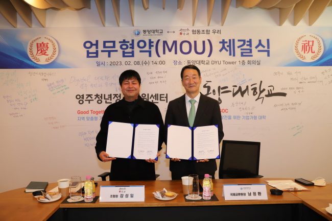 ▪ 일자리 창출 활성화를 위한 정책개발과 사업계획 ▪ 일자리 창출 효율화를 위한 정보 상호 공유 및 협의 동양대 국제교류원(원장 남정환)은 협동조합 우리(조합장 강성일)와 2월 8일(수) 청년정주지원센터 회의실에서 업무협약을 체결했다. 양 기관은 이번 업무협약을 시작으로 상호연계를 통해 일자리 창출을 위해 노력하고 협력할 예정이다. 주요 협약내용은 △일자리 창출 활성화를 위한 정책개발과 사업계획 △일자리 창출 효율화를 위한 정보…