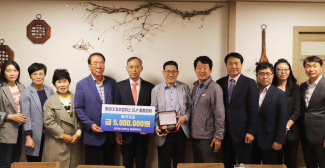 [사진설명] 지난 5월 21일 열린 영주캠퍼스 GLP 총동창회 발전기금 전달식 사진. 황갑식 회장(사진 오른쪽에서 6번째)이 권광선 총장에게 발전기금을 전달했다. 대학원 영주캠퍼스 글로벌리더십(GLP) 총동창회에서 5월 21일(목) 모교에 발전기금 5백만원을 전달했다. 전달식에는 권광선 총장과 황갑식 회장 등 관계자 15명이 참석했다. 전달식에서 황갑식 회장은 “적은 금액이지만 훌륭한 인재를 양성하고 모교의 역량을 강화하는데 조금이나마 도움이 되었으면 좋겠다”고 했다. 권광선…