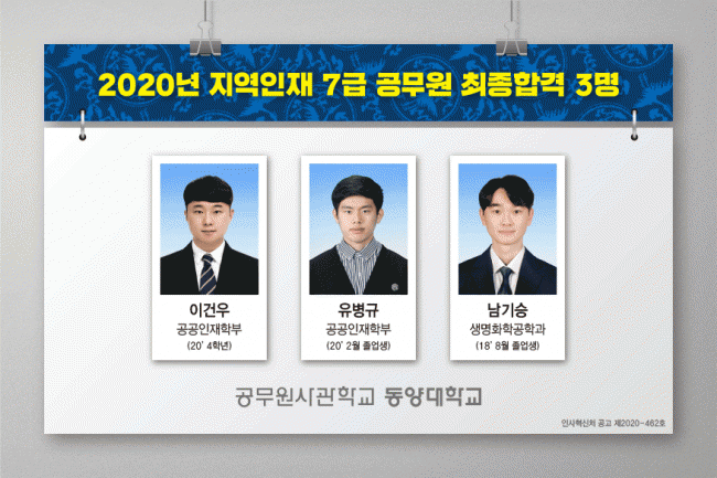 [공무원사관학교] http://poa.dyu.ac.kr 동양대학교(총장 권광선)는 인사혁신처가 시행하는 2020년도 국가직 지역인재 7급 수습직원 선발시험에서 행정직 2명, 기술직 1명 최종합격자 3명을 배출했다고 밝혔다. 국가직 지역인재 7급 선발시험은 대학의 추천을 받은 학과성적 상위10%이내인 우수학생이 1차 필기시험, 2차 서류전형, 3차 면접시험을 거쳐 최종 선발된다. 합격자들은 1년간 중앙행정기관(부·처·청)에서 수습근무를 한 뒤 국가직 7급 공무원으로 임용된다. 이상학 동양대학교 공무원사관학교원장은 “경북지역 18개 대학에서…