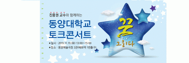 「꿈 ★ 그리다」동양대 토크콘서트 일시 : 2019.11.19(화) 13시~15시(2시간) 장소 : 동양예술극장(서울 종로구 대학로14길 29, 혜화역 1번출구) 대상 : 동양대학교 수시모집 지원자, 학부모, 교사, 고교재학생 등 선착순 200명 행사 내용 1부 : 특강 “디지털 이미지의 미학”(진중권 교수) 2부 : 토크 콘서트