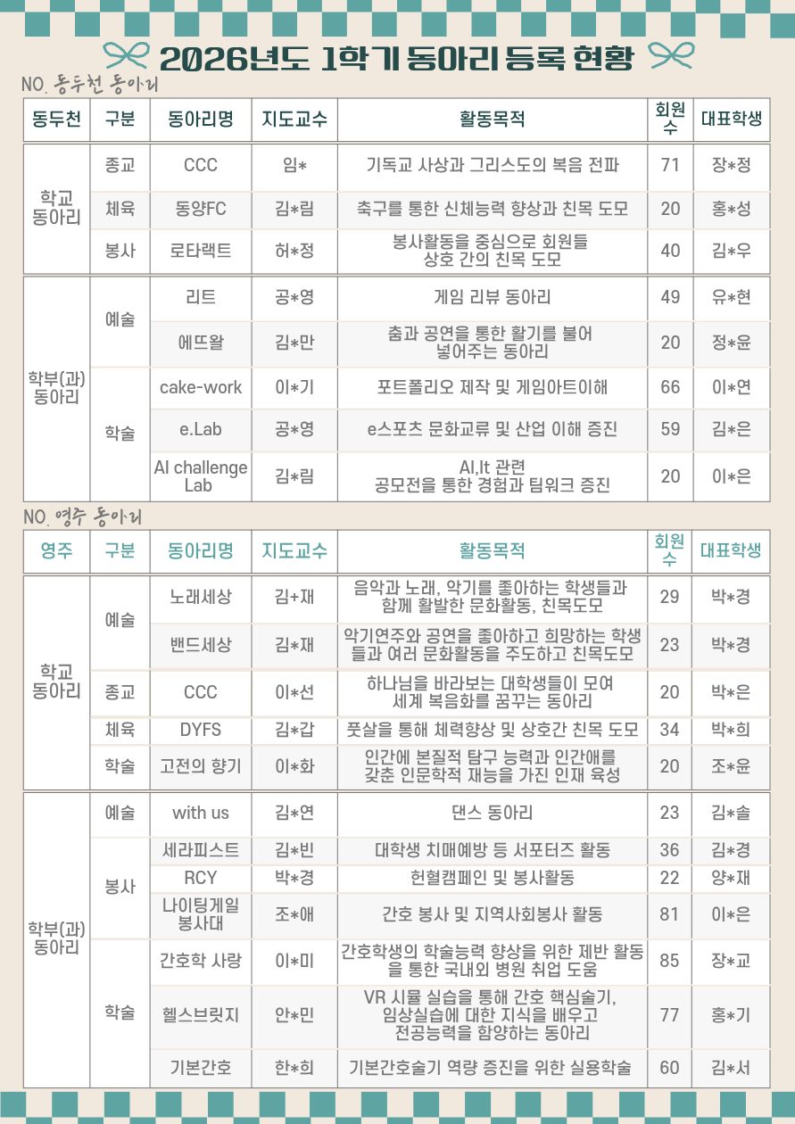 - 동아리등록 기간은 학교 홈페이지에 공지(매학기 개강 2~3주 전)