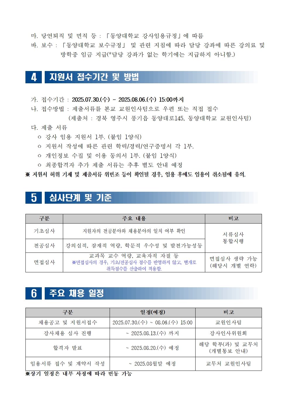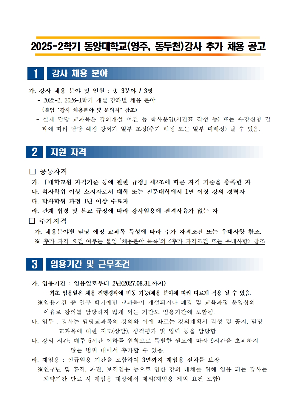 2025학년도 2학기 동양대학교 강사 추가 채용 공고